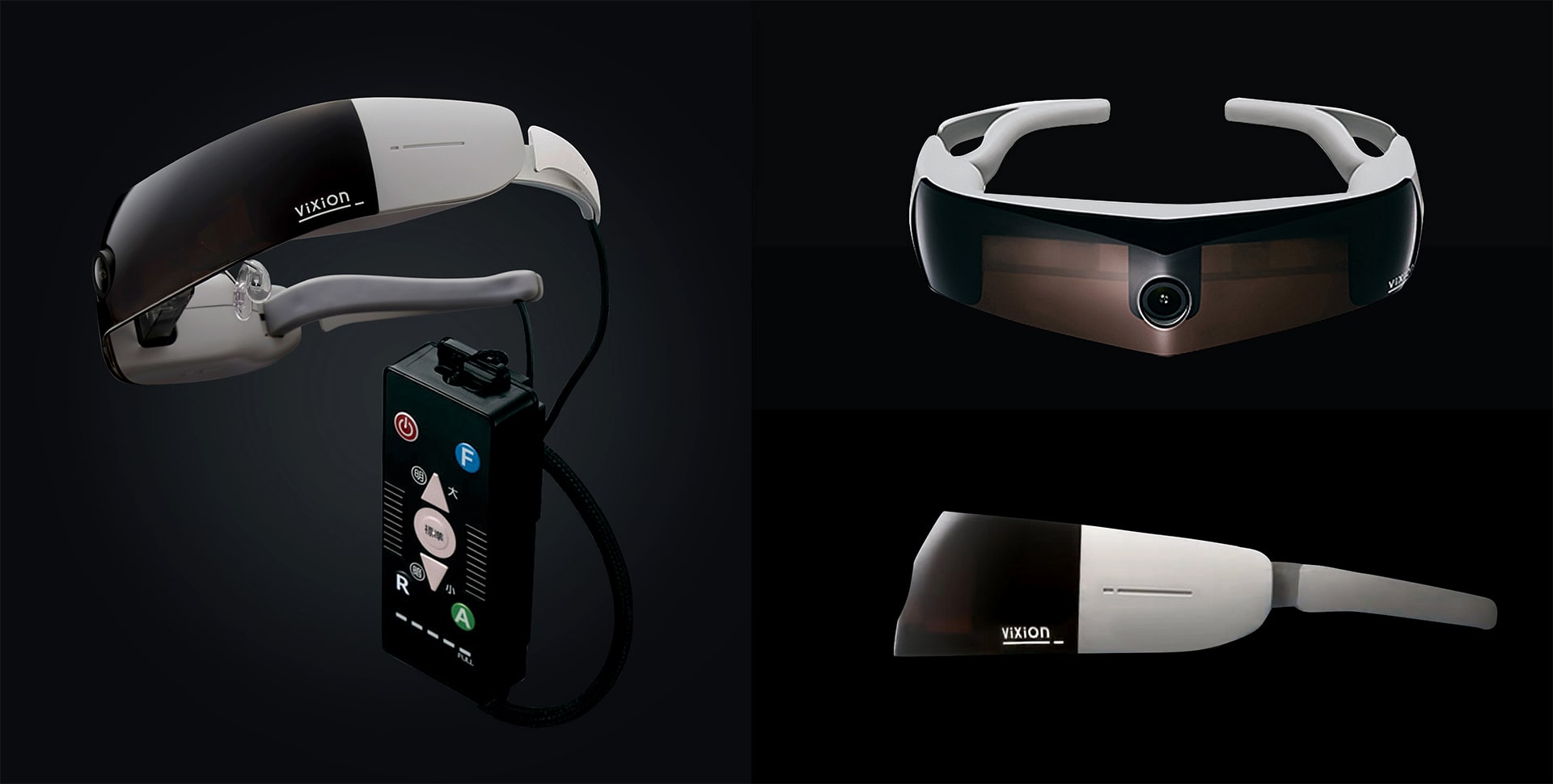 外の気配を感じられるシースルー(透けて見える)構造。 機能している方の眼を中心にご使用いただけるよう、ハーフミラー層内のディスプレイは左右に配置しています。