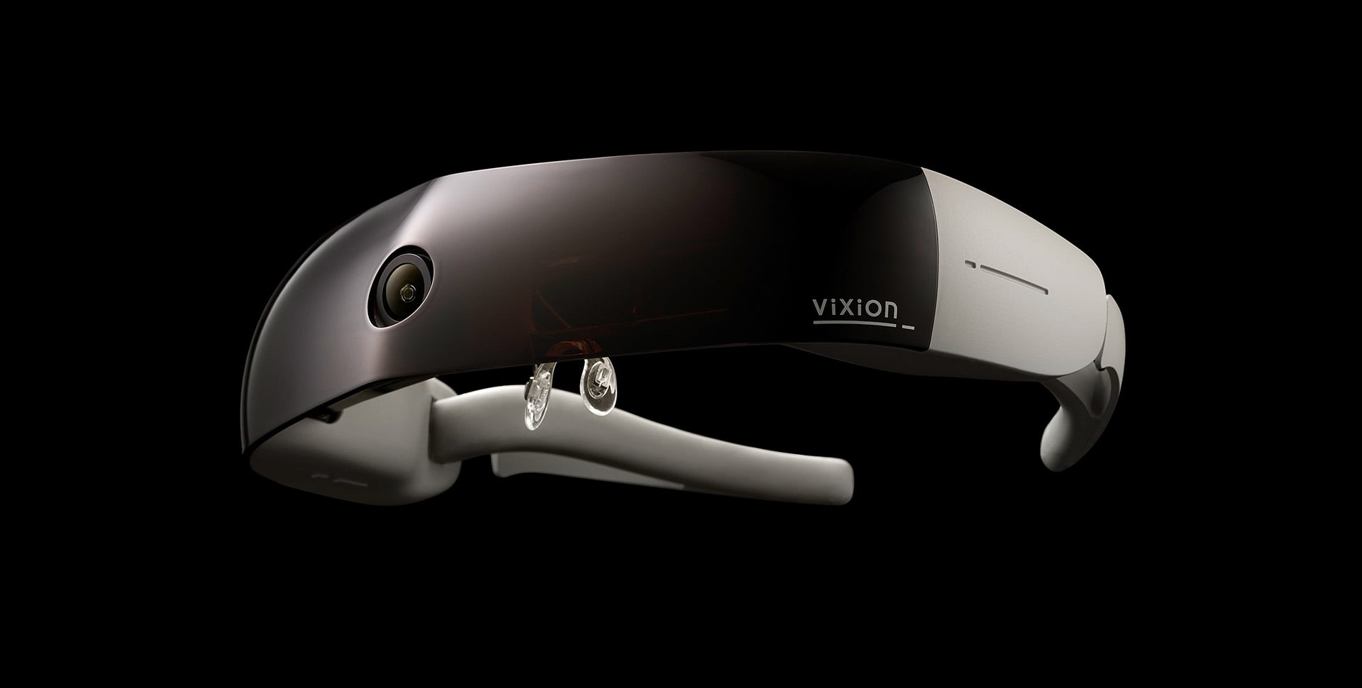 フレーム中央には小型カメラ、左右の張り出し部には小型プロジェクターを内蔵。 カメラで捉えたわずかな光を増幅して、ハーフミラー層に鮮明な画像として投射します。
